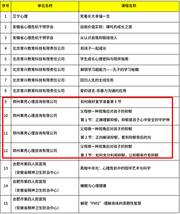 入选课程分别为:《如何做好复学准备第3节》、父母换一种视角应对孩子的抑郁中《第1节:正确理解抑郁,抑郁是孩子心中安全的守护神》《第2节:正向解读抑郁,看到抑郁背后的光》以及《第3节:如何充分利用抑郁,让抑郁来疗愈抑郁》。课程以科学严谨的态度、通俗易懂的表达和完整清晰的结构,深入剖析了抑郁情绪背后的心理机制,为家长提供了理解与陪伴孩子的新视角。