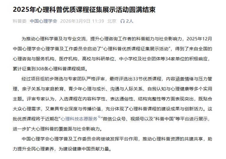 果壳心理自研课程入选中国心理学会2025年心理科普优质课程